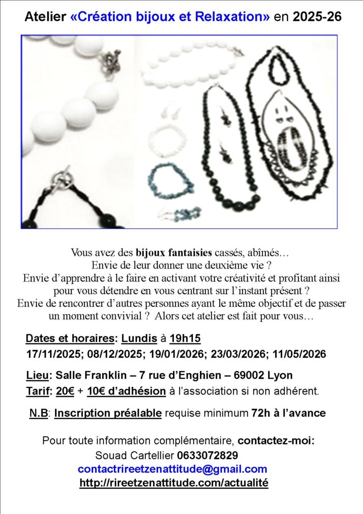 L’association Rire et Zen’Attitude vous propose un atelier où vous apprendrez à refaire vos bijoux: colliers, bracelets, boucles d’oreilles avec le fil. Le matériel pour faire un ensemble vous sera fourni. Si vous avez vos bijoux amenez-les pour les transformer. Si vous n’avez pas nous vous fournissons le nécessaire de ce que nous avons.