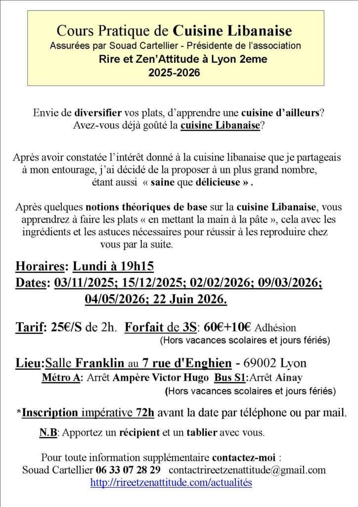 - L’atelier dure 2h à 2h15, autour de la cuisine libanaise avec différents plats salées ou sucrées.