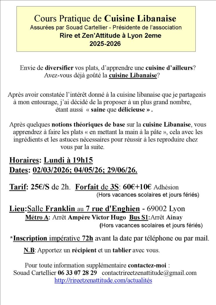 • L’atelier dure 2h à 2h15, autour de la cuisine libanaise avec différents plats salées ou sucrées.